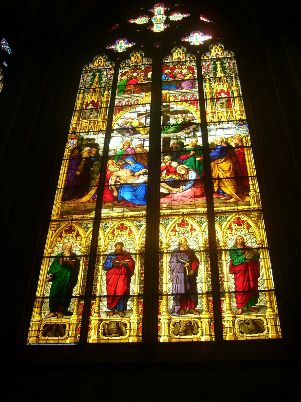 "Так в 2007 году собор обрел новые витражи на южных окнах, которые были уничтожены во время Второй мировой войны. Витражи состоят из 11500 одинакового размера кусочков цветного стекла, расположенных случайным образом на компьютере, образуя красочный "ковер".