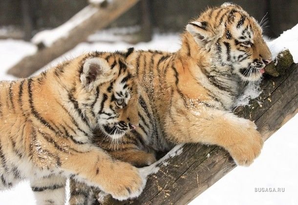 Тигрята частенько борются друг с другом. Так они бессознательно отрабатывают приемы, которые им пригодятся позже, в схватках с соперниками.
