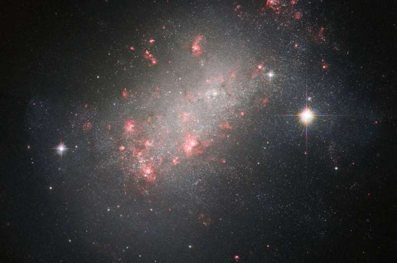 Телескоп «Хаббл» сделал снимок неправильной галактики NGC 1156. В ней находятся тысячи ярких звезд, как в спиральных галактиках, но NGC 1156 не хватает характерной «извилистой» структуры. На снимке выделяются ярко-красные цветы, скрученные из облаков пыли - это места интенсивного звездообразования. Галактика также излучает диффузное свечение, подобно эллиптической галактике. Ядро NGC 1156 состоит из более старых красных звёзд.