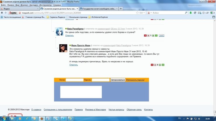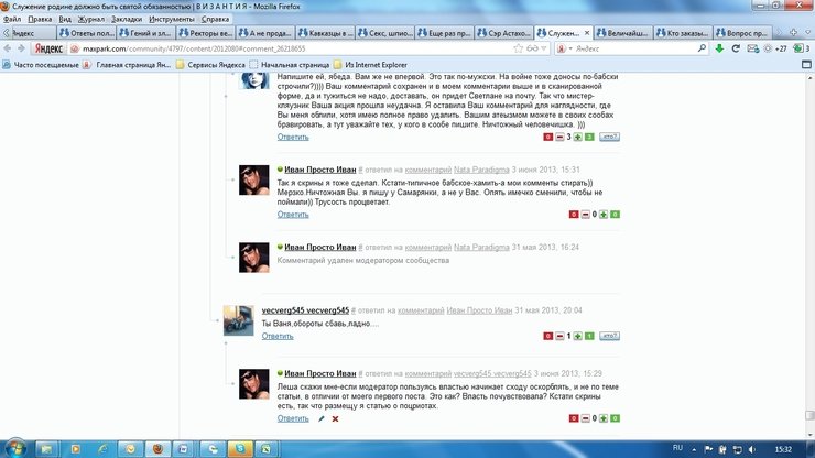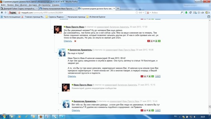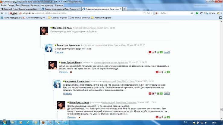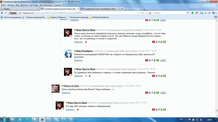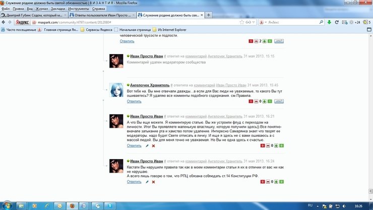 Тут в первой статье "Размышлений о Макспарке" мне задавался вопрос - о каких поцриотах я писал. И надо же такому случится, что именно с таким поцриотом меня свел случай. Ответил я комментарием на одну статью в сообществе "Византия" К ее администратору и основателю сообщества Самарянке я отношусь с уважением, хоть и наши точки зрения практически не совпадают. Со Светой мы спорили еще с времен Ньюсленда, но всегда довольно корректно. И тут отреагировал я комментанрием на статью про армию, и место в ней священников. Комментарий довольно безобиден. Он есть на скринах, так что судите сами. Общий его смысл-что РПЦ должна соблюдать ст.14 Конституции, поэтому стоит закрыть рот. А дальше началась вакханалия. Я подвергся всевозможным оскорбления модератора этого сообщества. Которая сразу начала с хамства в мой адрес, вместо обсуждения темы статьи. Потом данное создание - регулярно меняющее ники - по удаляло мои ответы, оставив свое хамство.