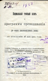По окончании субботника нежданно-негаданно декан одного из факультетов академии подарила замечательную книгу с длинным названием: «Нормальный учебный план и программы преподавания для низших сельскохозяйственных училищ по положению 26 мая 1904 года». План и программы были составлены Совещанием по организации низших сельскохозяйственных училищ 1912 г. при Департаменте Земледелия и одобрены Господином Главноуправляющим Землеустройством и Земледелием для временного применения в этих училищах. Отпечатана книга в Санкт-Петербурге в типографии В. Киршбаума (отделение), Новоисаакиевская, 20 в том же 1912 году и включает в себя 110 страниц.