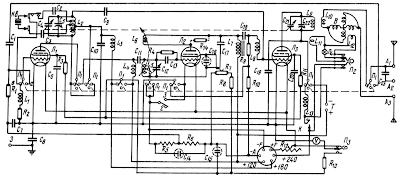 Подключение питания к радиостанции осуществлялось посредством переходной колодки с клеммами, шланга питания и фишки (одна партия станций была выпущена для питания от сети переменного тока). Для контроля за режимом питания имелся вольтметр со шкалами 0-3 в и 0-300 в. Переключение осуществлялось "белой" (на фото пожелтевшей от времени) кнопкой вольтметра. Для того, чтобы в случае захвата радио врагом нельзя было предположить диапазон, частоту и расписание, или, не дай бог, прямую сдачу сеанса радиосвязи, настройка велась по таблицам, так как шкалы приемника и передатчика имели условные деления. Прием велся на слух, на головные телефоны, а передача - малогабаритным ключом. Антенна "наклонный луч" - провод, который забрасывался на любое дерево или строение, и секционированный противовес длиной 3, 6, 9 или 12 м (в зависимости от частоты), располагаемый на высоте 1 м от земли в направлении на корреспондента. При выборе оптимальной рабочей частоты подготовленному радисту удавались обеспечивать надежную связь с радиоузлом, имевшим магистральную аппаратуру и направленную антенну, на расстояниях до 700 км. Железяка в 2 килограмма и три !!! лампы, а сколько бед принесла фашистам!