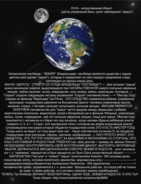 Но для них Высшие поставили спектакль об их "пребывании" на Луне, в том числе, заложив этот спектакль в память астронавтов. Отсюда и все странности с памятью и воспоминаниями американских астронавтов по поводу лунного путешествия.