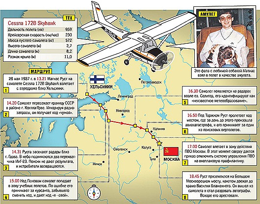 Мне очень понравилась версия о рекламном характере мероприятия. Оказывается, отец Матиаса Дитер Руст работал дилером «Цессны» в Западной Европе. К середине восьмидесятых объем продаж самолетов этой фирмы резко сократился, и, чтобы поднять интерес к марке, нужна была яркая рекламная акция.