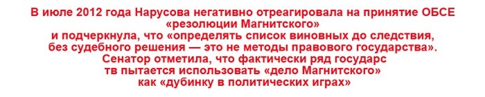 В июле 2012 года Нарусова негативно отреагировала на принятие ОБСЕ «резолюции Магнитского» и подчеркнула, что «определять список виновных до следствия, без судебного решения — это не методы правового государства». Сенатор отметила, что фактически ряд государств пытается использовать «дело Магнитского» как «дубинку в политических играх»