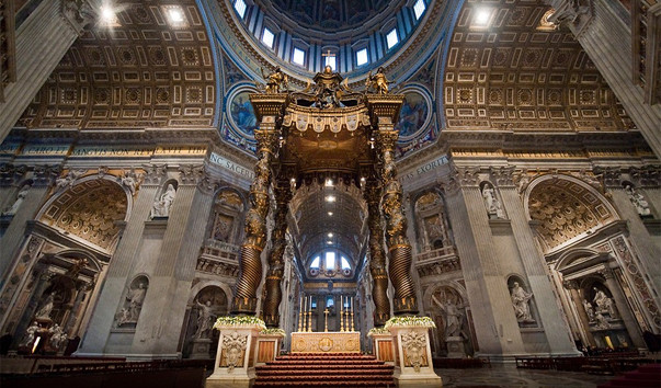Сквозь балдахин видна находящаяся в центральной апсиде и также созданная Бернини кафедра св. Петра.