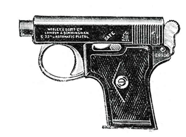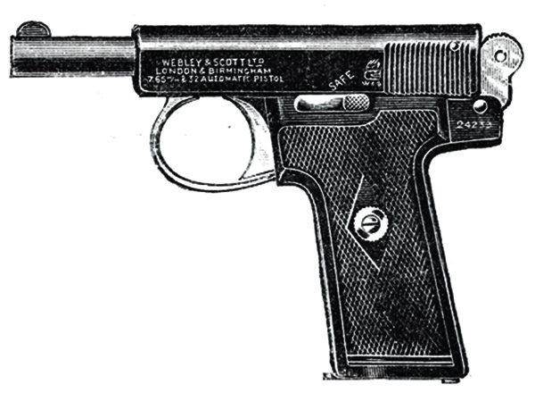 Компактное оружие самообороны пользовалось спросом в Российской Империи, хотя практически не выпускалось. В основном оно ввозилось с Запада и было доступно для любых групп населения. Английский автоматический 7-зарядный пистолет Веблей и Скотт. Калибр 6,35.