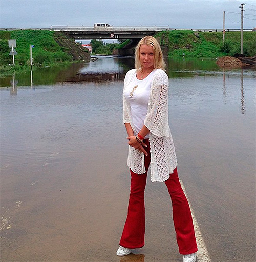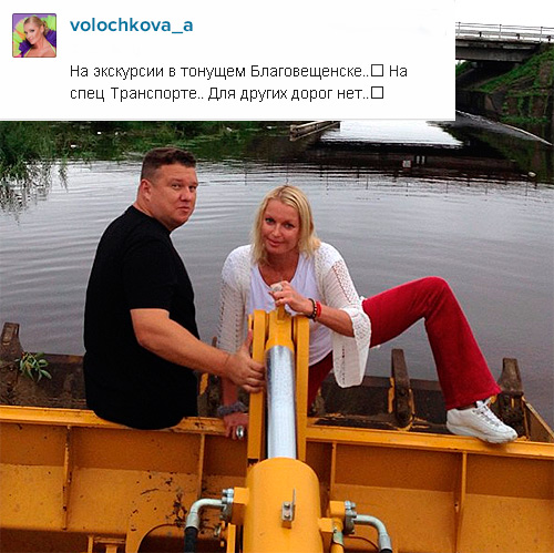 Снимки балерины на фоне разбушевавшейся природы в Приамурье, опубликованные в Твиттере, не обсудил разве что ленивый. Волочкова позирует в поселке Владимировка на фоне большой воды, то сидя в ковше экскаватора (щелк), то в надувной зеленой лодке (щелк), и то и босиком в воде. «По колено в воде на краю земли... Бедные люди», - так подписаны некоторые фотографии.