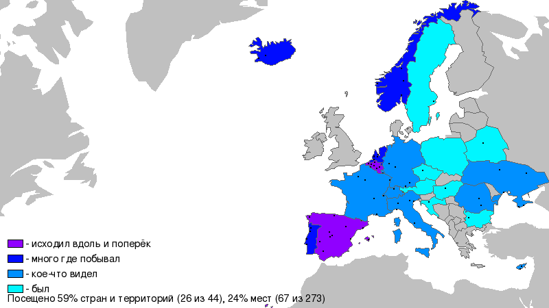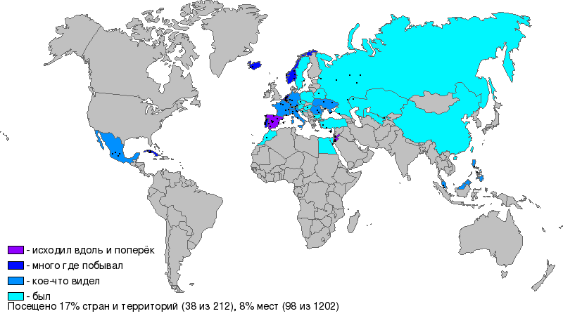 В профилях ЖЖ чаще всего встречаются карты двух типов: та, где посещенные страны отмечаются красным (она меня раздражает) и карты от myworldmap.ru, которой я пользуюсь. Она меня устраивает, но, может быть, есть что-то еще более удобное? Моя карта выглядит так: