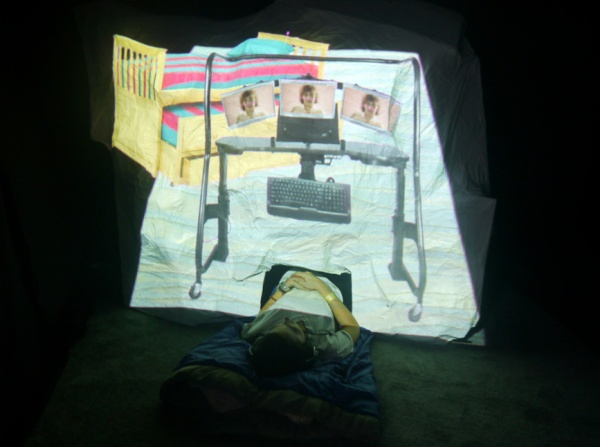 В этой инсталляции женщина в темной комнате лежит на полу под звуки не очень приятных на слух мелодий, в то время как пояснительный текст сообщает нам, что так автор хотел выразить свое видение того, как интернет захватывает наши души в прямом и переносном смыслах. Детка, если бы не интернет, ты как минимум не создала бы сие «нечто».