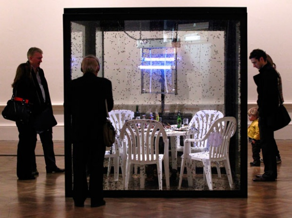 Еще одна работа Дэмиана Херста «Давайте есть сегодня снаружи» (“Let’s Eat Outdoors Today”). Как видите – это герметичный и прозрачный бокс в котором стоит стол с едой и стулья, и который забит живыми мухами.