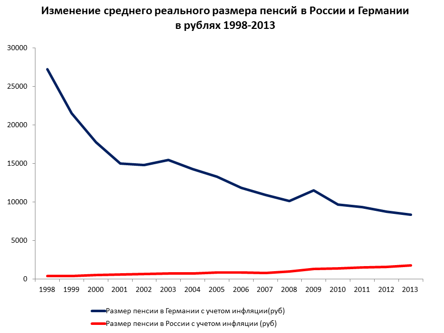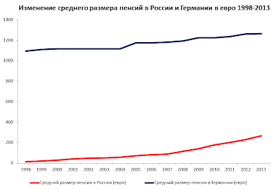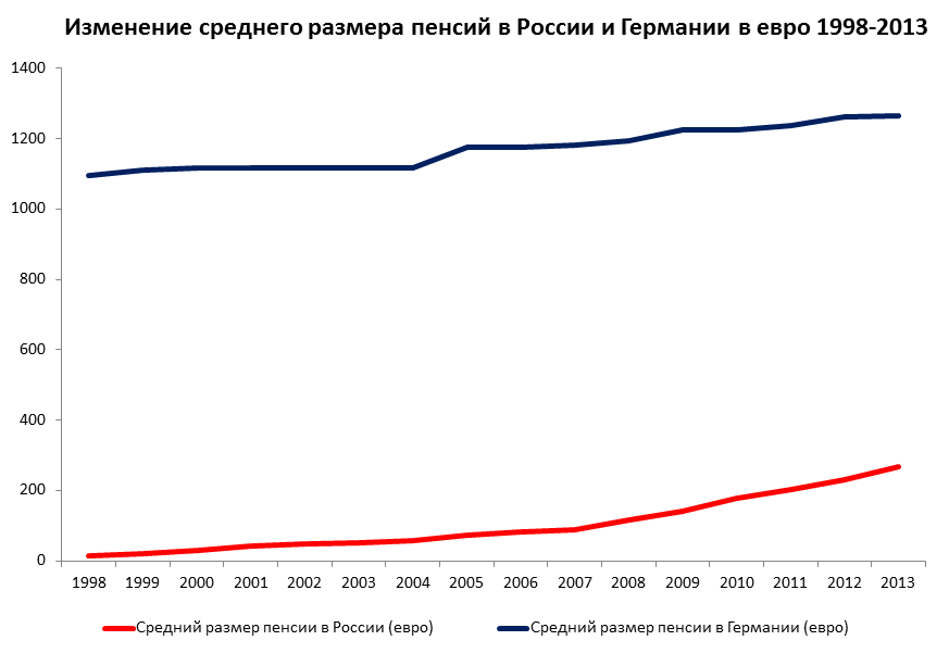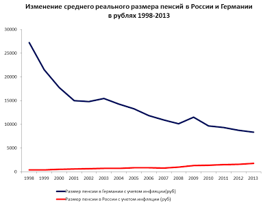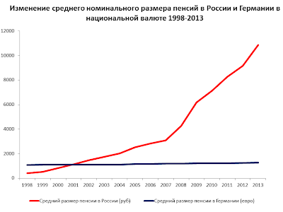 График это непригоден для сравнения размера пенсий, так как пенсии приведены в разных валютах - рублях и евро, но очень четко демонстрирует динамику номинального роста пенсий. В то время как в Германии пенсии с 1998 года выросли в номинальном выражении всего на 15,5 процентов, в России за этот же период номинальный рост пенсий составил 27 раз.