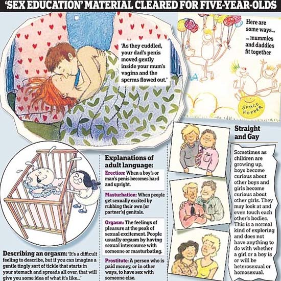 Пятилетним детям Великобритании расскажут про все, что касается сексуальных отношений, даже научат онанизму. Конечно, кто еще, кроме школы, сможет научить такому ответственному делу? И не важно, что потом мозги уже будут не способны усваивать какую-либо иную информацию. Ведь никому не нужно такое количество думающих и знающих людей, которые смогут вырасти из тех, кто сейчас оказался на школьной скамье.