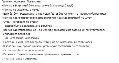Поветкин, кстати, и вправду молодец. В частности в том, что он, в отличие от некоторых своих болельщиков, тупо бубнящих про "прячущегося от боя Кличко", честно признал, что Кличко сильнее.