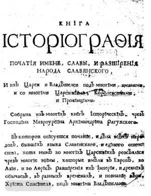 «Книга историография початия имени, славы и разширения народа славянского. Собрана из многих книг исторических, через господина Мароурбина Архимандрита Рагужского. Переведена с итальянского на российский язык и напечатана ..... в Санкт-Петербургской Типографии, 1722, августа в 20 день».