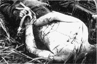 Нас заставили лечь. Русский солдат ударил меня в грудь штыком. Я перевернулся- тогда он ещё 7 раз ударил меня в спину. Очевидно, русские решили, что я мёртв. Я слышал, как мои товарищи ревут от боли. Я потерял сознание. На следующее утро меня нашли немецкие солдаты. Я увидел, что голова моего товарища лежащего рядом была разбита. Большинство других было мертво или умерло позже от ран..."