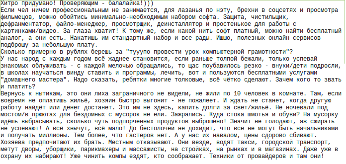 Я ведь ещё и по квартирам клиентов хожу, установить комп, подключить его к тырнету, некоторым просто туупо провести урок компьютерной грамотности. Так я вижу как народ живёт в каждой комнате по телеку цифровому ( у нас простого телевидения в стране уже нет). Ноутбуки, планшеты, телефоны чуть-ли не для связи с марсианами. Шкафы ломятся от шмоток, по тридцать штанов на одну единственную жопу, обуви как на сороконожку.