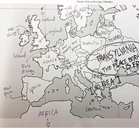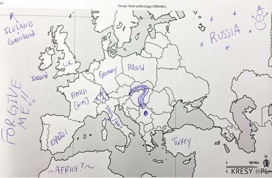 Среди прочих перлов: надпись «равиоли» вместо Италии, «мини-Польша» вместо Польши, «ох, как холодно» - тоже вместо Польши, «жаркое из картошки» вместо Голландии и Бельгии, вместо Восточной Европы – «Здесь люди носят шубы» и «Они здесь все хитрецы», вместо Турции – «Здесь Константинополь? Я играл в «Век империй-2», вместо Украины – «Монголия». Молдавия, Литва, Латвия и Эстония оказались на Балканах. Вместо Северной Африки просто «Африка» с припиской: «Это что за страна? Я не такой тупой!» и на месте России надпись по-английски: здесь моя родина.