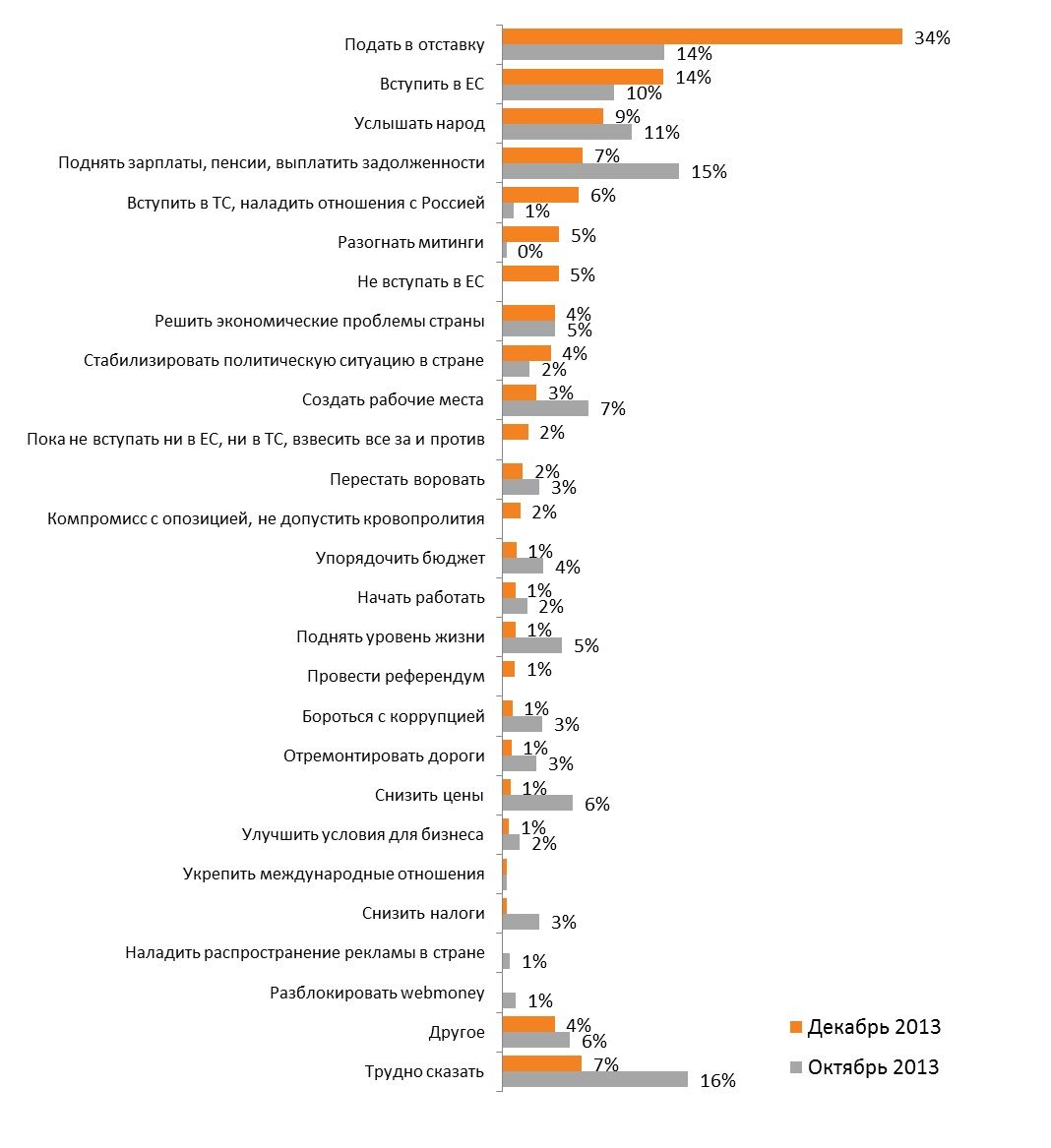 Самый простой приём - разбить группу, ответы которой не устраивают, на несколько ответов. В данном случае желательный ответ "Вступить в ЕС" всего один - "ЗА" получили 14% (вариант "Подать в отставку" просто смешон - каким это правительством у нас были довольны?).