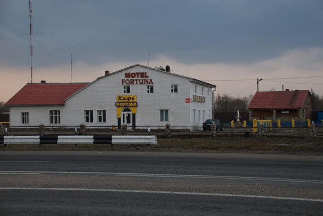 Мотель "Фортуна", слева от дороги. Двухместный номер - 700 рублей, ужин на двоих с водкой - 500 рублей. Тихо, спокойно, но кухня так себе. Санузел общий на первом этаже. Постояльцев, кроме нас, больше не было, так что это не напрягло.