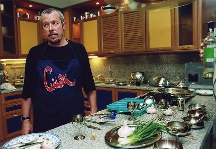 Пьёт шампанское и закусывает бутером с черной икрой.