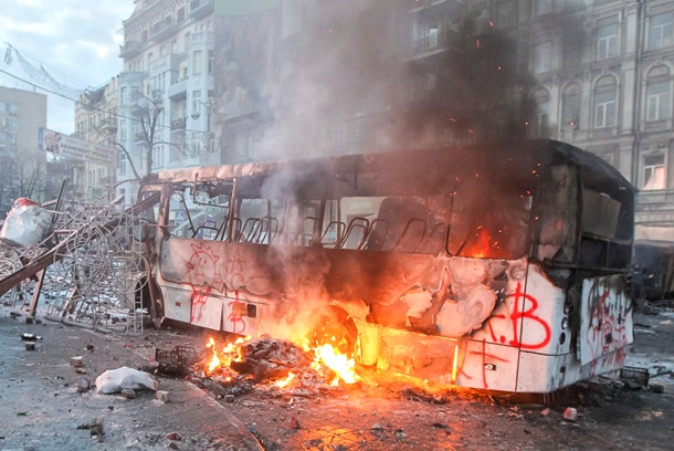 А вот полуобгоревший автобус. Жертва праведного гнева национально озабоченных евроинтеграторов. Хорошо, что в нём не спалили людей.