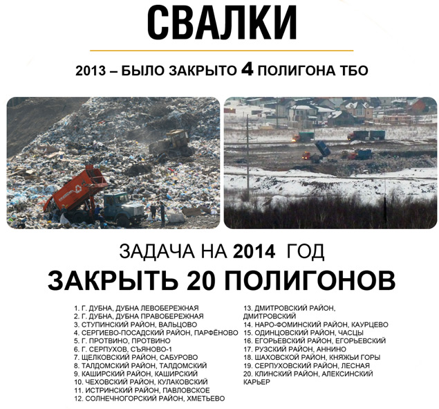 - В прошлом году мы поставили задачу за три года закрыть 24 полигона твердых бытовых отходов. Уже закрыли четыре. Сегодня наша цель – ликвидировать оставшиеся. В том числе свалки в Долгопрудном, Кучино, Егорьевске и Дубне.