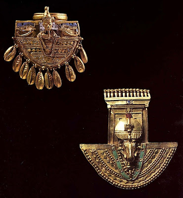 Появляются и типично египетские формы украшений: пектораль - нагрудное украшение, носимое на цепи или как брошь и изображающее различных божеств и сценки из мифов; и нечто наподобие парика, в котором вместо волос - пряди из золотых бусин или самоцветов.