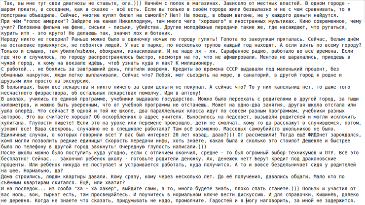 пасибо мадам, поржал от души, про инет 20 летней давности! Браво! Копьютеры на основе 286-го процессора, обходилась советскому хозрасчетному предприятию в среднем по 40 тыс. рублей. повсеместно, в частных руках, их не могло быть, разве что парочка, на город? в игрушки поиграть. о каком таком инете бредите?) хоть имеете представление о модемах того времени, как через домашний телефон связь шла и по каким тарифам, в курсах? телефонное подключение было позже. вы превзошли самоё себя! сопоставьте мощость железа и ПО. сама ось весила не больше метра.