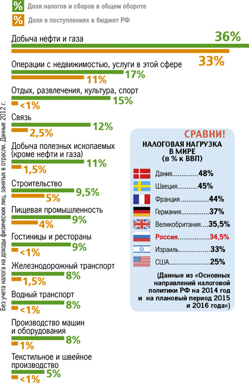Между тем, как утверждает Минфин в «Основных направлениях налоговой политики РФ», налоговая нагрузка у нас в сравнении с другими странами средненькая. А если оставить за скобкой налоги, которые платит неф-тегазовая отрасль, то на всех остальных нагрузка - и вовсе ниже среднего. Чего тогда плачемся?