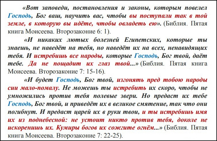 Они навязали этим разноплеменным кочевникам придуманную ими религию, основанную на образе бога-рабовладельца, навязали им свои законы, якобы продиктованные их божеством, в которых ни разу не упоминается слово «совесть», но многажды раз употреблено в повелительном наклонении слово «убей!», и однажды послали их кочевать по Миру, на все четыре стороны света, исключительно с одной целью — завоёвывать для них государства и города, построенные другими народами.