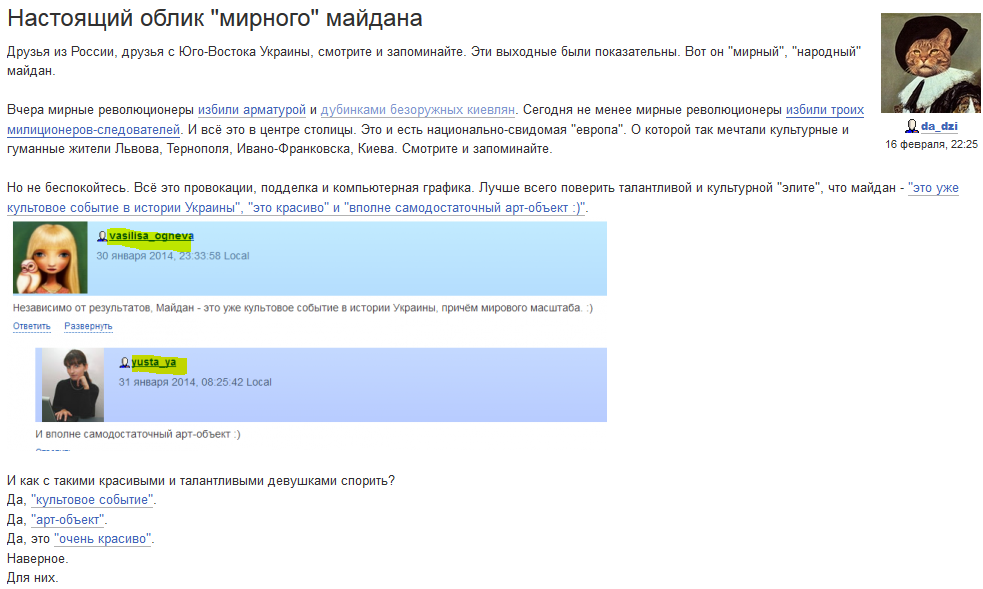Я живу в России (в провинции, но не в глубинке). Внимательно наблюдаю за составом участников оппозиционного движения. И я вижу, что в нем принимают участие не только "понаехавшие" туда "свидомые" экстремисты. Там представлены различные социальные страты.