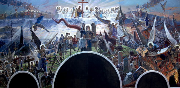 На картине рай условно справа. Это Восток. Ад — слева, как образ Запада, с его поистине двойной моралью. С правой стороны у меня на холм взбирается как бы сама Русь, с ее мучениками. Я показал там и реальные личности — например, Дмитрия Донского, Преподобного Серафима. Там есть матрос с «Курска», простой парень, который мог и выпить, сквернословить, но в момент познания истины ценой своей жизни земной остановил реактор. Это обобщенный образ простого человека, который, когда надо, грудью закроет ближнего своего. Поэтому на картине можно увидеть воинов, проливших кровь за Веру, за возможность нашу жить в Отечестве, любить, строить, продолжать жизнь. Там есть и герой нашего времени — солдат Женя Родионов, которого почитают представители разных религиозных конфессий. Он не просто отказался снять православный крест. Он его поныне достойно несет за всех нас. Моя цель и была показать, как человек САМ СЕБЯ взвешивает на небесных весах. Это шествие к престолу Господню и некое понятие крестного хода. Сейчас приходит осознание необходимости таких вот шествий в действительности.