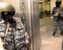 У входа в офис находятся шестеро милиционеров с автоматами. Посетителей, включая журналистов, внутрь они не пропускают. На улице находятся четыре милицейских автомобиля, в том числе два микроавтобуса.