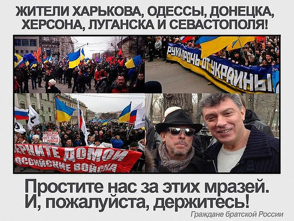 Всё правильно сказано. Но почему это обращено только к киевской интеллигенции? Разве у нас в Москве картина не такая же в точности? Разве наши либералы не стояли на Болотной и далее точно так же рядом с доморощенными нациками? Да, брезгливо изгибая губы и, по Щедрину, поворотя рыла на сторону - но стояли и маршировали вместе! Или кто-то хочет сказать, что не знал, кто его союзники? А разве секрет, что из Москвы на майдан катались не только российские "национал-уменьшители", вслед за бандеровцами чающие "краха империи", но и вполне себе либералы и гуманисты? И уже поглядевши на всё своими глазами, устроили шествие в поддержку майдана...