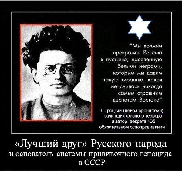 Один из основоположников геноцида русских - лейба бронштейн (троцкий), который ввёл бережно сохраняемый и охраняемый его последышами до сих пор прививочный геноцид наших детей.