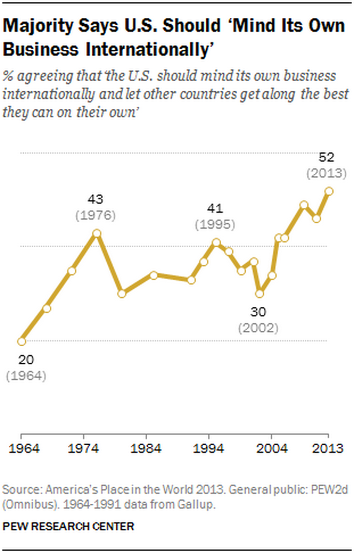Результаты апрельского социологического опроса Центра Pew стали своеобразным рекордом: сегодня максимальное число американцев в современной истории страны выступают против международных интервенций США, и считают, что руководству страны «следует заниматься своими внутренними делами».