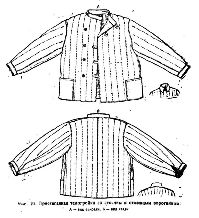 Вплоть до начала 30-х годов облик ватной телогрейки в Красной армии практически никак не изменился, только вот все завязки были заменены пуговицами. Вот описание ватной телогрейки, утверждённое Комитетом по стандартизации НКЛП СССР2 8 октября 1932 года: «Телогрейка — куртка ватная однобортная, прямого покроя, застёгивается по борту доверху на 4 пуговицы имеющимися в левом борте четырьмя пришивными петлями (шлевками). Полы прямые без вытачек, с боковыми накладными карманами, простёганные сквозь верх, вату и подкладку параллельными долевыми машинными строчками. Расстояние между простёжками 6 см. Спинка прямая, цельная или с долевым швом посередине, на талии стягивается затяжниками с металлической пряжкой. Простёжка спинки одинакова с полой. Воротник стоячий мягкий, застёгивается на одну пуговицу шлевкой, пришитою к левому его концу. Высота воротника — 3 см. Рукава одношовные, заканчиваются внизу небольшой шлицей и манжетами, застёгивающимися на одну пуговицу шлевкой, пришитой к концу верхней половинки манжета. Простёжка рукавов одинакова с полой… Материал — верх — диагональ гимнастёрочная хаки; подкладка — бязь крашеная серая или хаки; вата х/б 2 сорта».