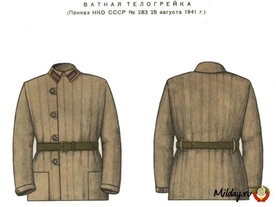 Приказом НКО № 283 от 1941 года был введен новый образец ватной телогрейки, которая в отличие от телогрейки старого образца, предназначавшейся к ношению под шинелью, теперь должна была носиться взамен шинели - то есть, командному составу выдавали шинель, рядовым - телогрейки.
