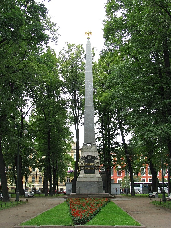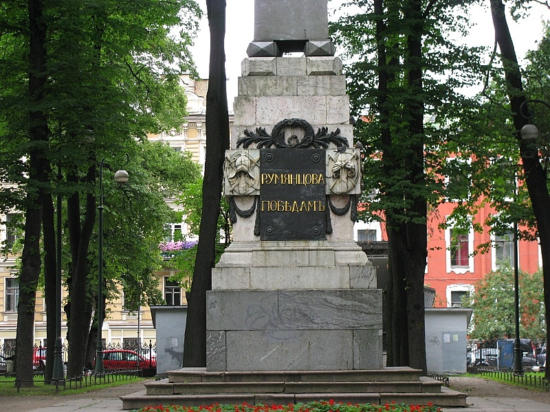 В 1795 году императрица Екатерина Вторая повелела воздвигнуть обелиск в честь победы своих войск в русско-турецкой войне.Командовал армией генерал-фельдмаршал Пётр Румянцев-Задунайский, поэтому и проект памятника был назван "Румянцова победам". Первоначально он был установлен на Марсовом поле, а затем перенесён на Васильевский остров, в сад, который стал называться Румянцевским.