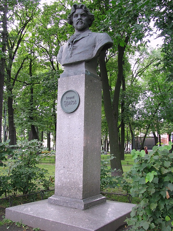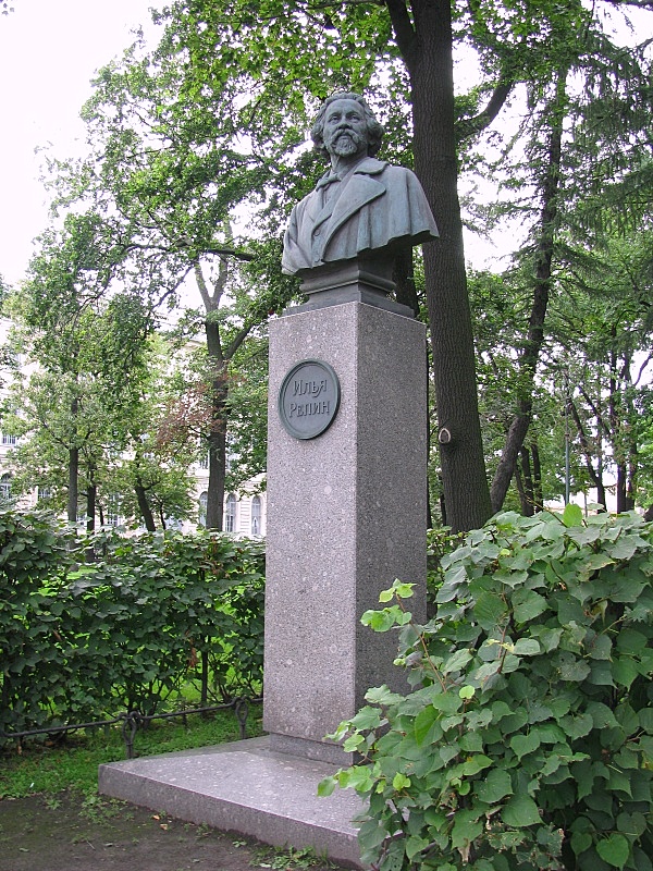 Здесь же установлены бюсты художников Репина иСурикова. Сад находится возле Академии художеств, в которой они учились.