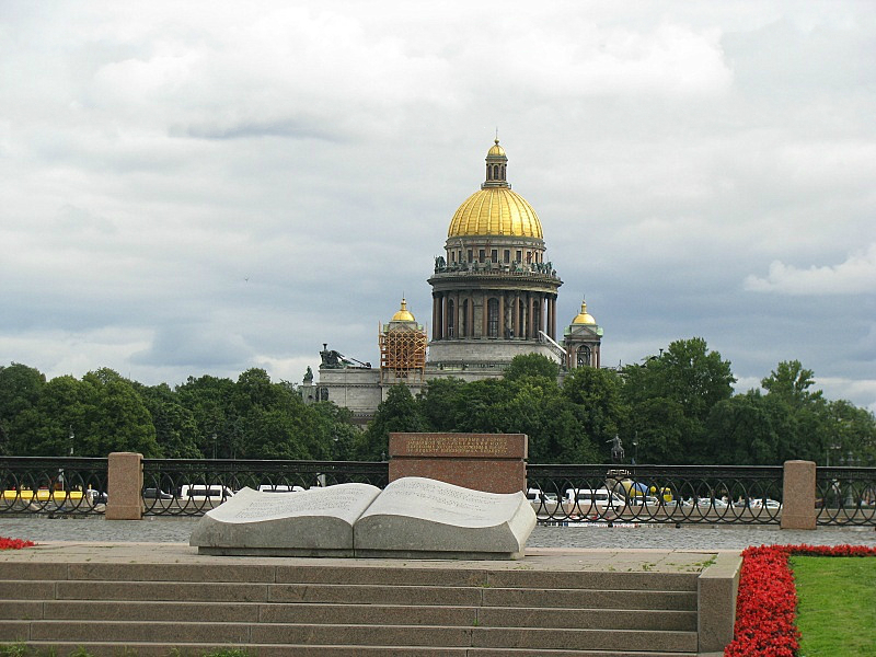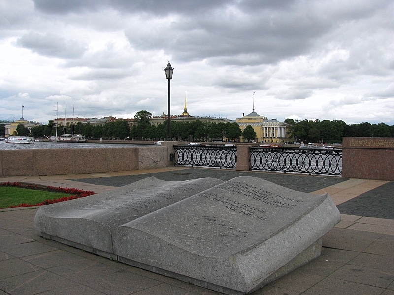 Памятный знак ПОСЛАНИЕ ЧЕРЕЗ ВЕКА в виде гранитной открытой книги с отрывком из поэмы А.Пушкина "Медный всадник".