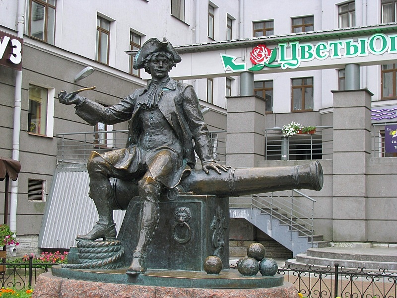 Бомбардир Василий Корчмин - герой легенды о возникновении названия Васильевский остров, он командовал артиллерийской батареей на острове и царь Пётр, отправляя ему приказы, адресовал их "К Василью на остров".Памятник был установлен в год 300-летия города, в 2003 году, авторы - студенты Академии художеств Григорий Лукьянов и Сергей Сергеев.