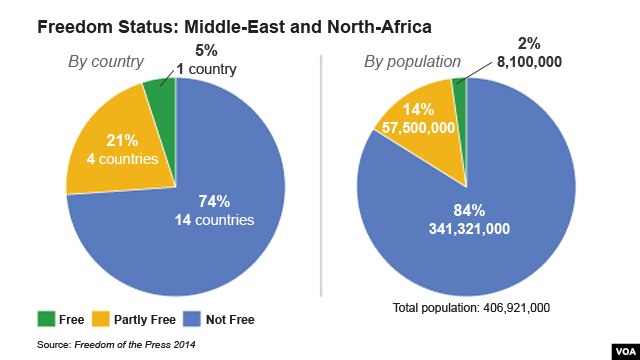 «Влиятельные авторитарные режимы, как Китай (185-е место в рейтинге) и Россия, сохранили жесткий контроль за местными печатными и вещательными СМИ, одновременно пытаясь контролировать более независимые взгляды, распространяемые в блогосфере или в иностранных новостных источниках… Условия в Евразии остаются мрачными: 97 процентов населения проживают в странах с несвободной сферой СМИ», – говорится в докладе.
