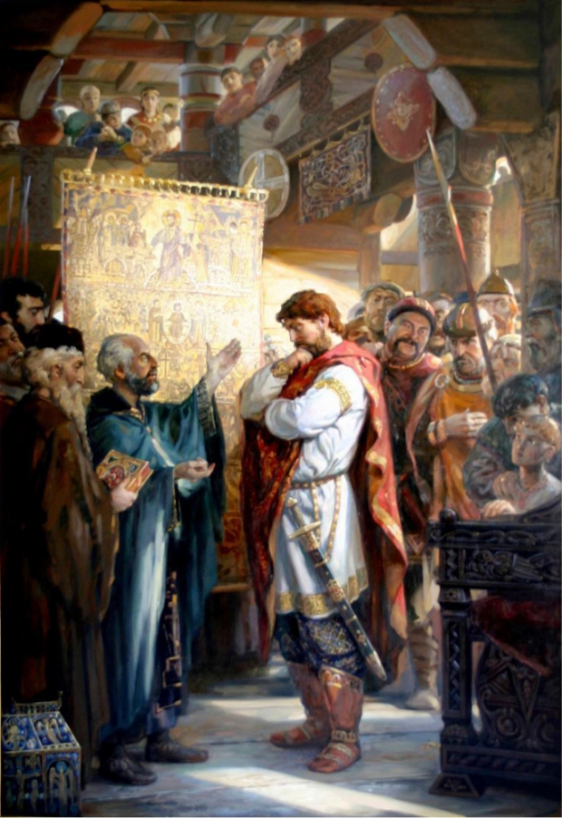 А теперь вопрос на засыпку. Возьмём кого-нибудь из знакомых нам руководителей позднейшего времени. Например «эффективного менеджера» Сталина, такого эффективного, что поставить человека к стенке ему ничего не стоило. И представим на мгновение, что во сне к нему явился мулла (мусульманский священник) и нежненько так посоветовал принять Ислам. Примерно таким вариантом истории кормит нас церковь, рассказывая о крещении Руси.