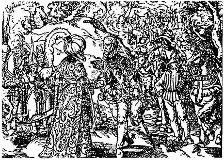 Рис. 93. Василии III принимает послов. Гравюра из книги С. Герберштейна.
