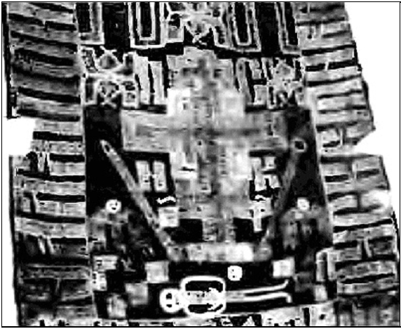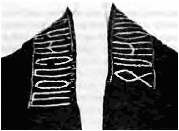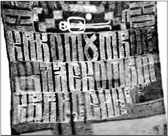 На рис. 1.31 —1.34 показаны надписи и изображения на этом русском монашеском одеянии XVII века. Подчеркнем, что здесь мы имеем уникальную возможность посмотреть — как же выглядели ПОДЛИННЫЕ одеяния XVII века. В столичных музеях мы сегодня такого обычно не увидим. По нескольким причинам. Во-первых, потому, что многие оригиналы XVI–XVII веков уничтожены в результате долгого и тщательного отбора, проводившегося историками за последние 300 лет. Во-вторых, потому, что подлинники того времени в подавляющем большинстве случаев просто разрушились естественным путем. Здесь же нам посчастливилось увидеть не только ПОДЛИННИК XVII века, недавно извлеченный из земли, но и ХОРОШО СОХРАНИВШИЙСЯ. Кроме того, он пролежал в колоде под землей все эти триста лет и потому счастливо избежал романовских чисток истории. А в наше время он по счастливой случайности попал в руки медиков. А не историков.