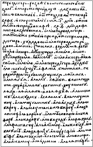 Нам могут сказать: текст Афанасия Никитина был кем-то искажен. Вставили тюркские выражения. Правда, после этого зачем-то бережно хранили в библиотеке Троице-Сергиевой Лавры. Однако можно указать и другие примеры подобного смешения русских и тюркских или арабских выражений в ПРАВОСЛАВНЫХ церковных текстах. Приведем пример, где речи о подделке быть не может.
