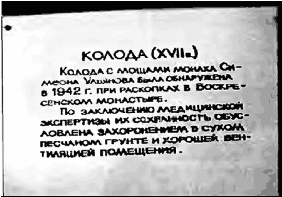 Рис. 1.30. Пояснительная табличка к колоде-гробу Симеона Ульянова в музее «Терем царевича Дмитрия» в Угличе. С видеозаписи 1999 года.