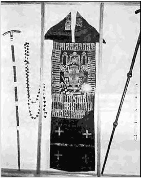 Между прочим, в 2002 году в Угличском архиве мы узнали, что СЗАДИ НА СХИМЕ ТОЖЕ ЕСТЬ КАКАЯ-ТО НАДПИСЬ. Будто бы она идет по краю схимы, а в центре — большое изображение Голгофы. Хотя буквы хорошо видны, текст, тем не менее, тоже не читается (как и «передняя надпись») и расценивается работниками архива как «религиозная тайнопись». Никаких фотографий или прорисовок «задней надписи» тоже якобы до сих пор нет. Более того, первоначально на монахе (в момент обнаружения колоды), поверх схимы, было еще какое-то облачение. Но оно будто бы бесследно исчезло и никаких более подробных сведений о нем не сохранилось.